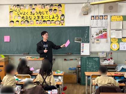 2年生は算数の学習で分数の量を感じ取るために、折り紙を2等分、4等分に折ってみて、できた形を確かめました。ここから、一つのものを等分に分けたいくつ分を「分数」で表せるとに気づきました。