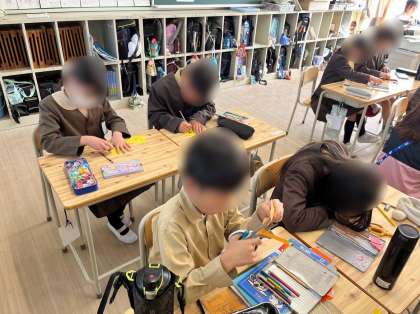 4年生は学級活動をしています。子どもたちはたてわり班でお世話になった6年生に向けてメッセージを書きました。これまでの学校生活で6年生との思い出を振り返りながら心をこめて書きました。