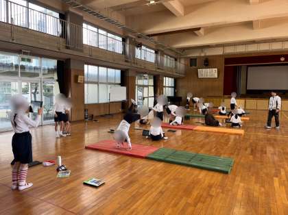 5年生は体育でマット運動の学習をしています。今回も学習端末で友だち同士、動画を撮影し合いながら自分の動きを確かめていきました。動画で見ると、自分の認識と実際の動きのズレが明確にわかるので自分で改善点を見つけることができます。