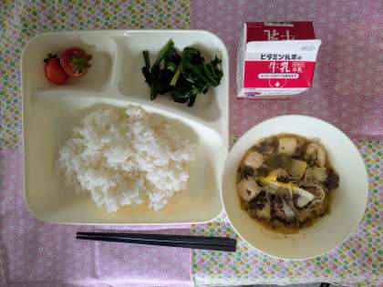 すき焼き煮、ほうれんそうのおひたし、いちご、ごはん、牛乳