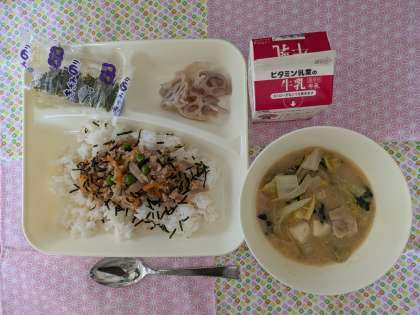 鶏ごぼうご飯、きざみのり、みそ汁、焼きれんこん、ごはん、牛乳
