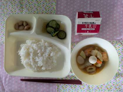 関東煮、きゅうりの梅風味、とら豆の煮もの、ごはん、牛乳