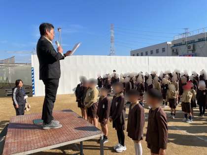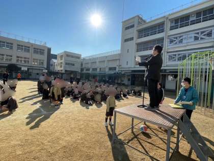 今朝は、暖かい日差しの中で、児童朝会を行いました。校長先生からは、3月8日が伝法小学校の152回目の創立記念日だったことから、伝法小学校の歴史についてお話がありました。
