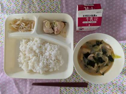 今日は、甘辛いタレがかかった焼きとり、具沢山のみそ汁、もやしの風味が効いたあえもので、大変好評でした。