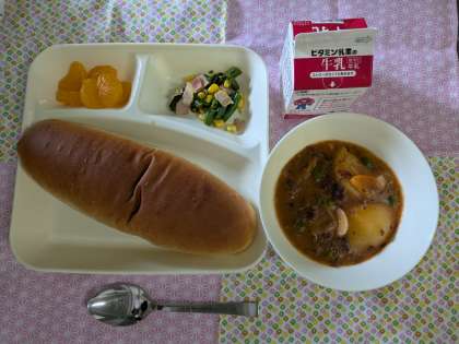 ビーフシチュー、ベーコンとさんどまめのソテー、みかん(缶)、黒糖パン、牛乳