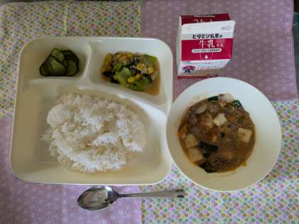 マーボーどうふ、きゅうりの中華あえ、ツナとチンゲンサイのいためもの、ごはん、牛乳