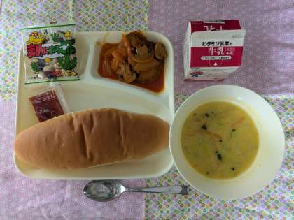 煮込みハンバーグは、ハンバーグをたまねぎ、マッシュルームと一緒にケチャップ、ウスターソースの味付けで煮込みました。マッシュルームが苦手という人がいましたが、ハンバーグは大好評でした。きのこは、体の調子を整える大事な働きがあるので、残さず一緒に食べてほしいですね。