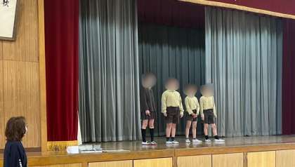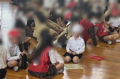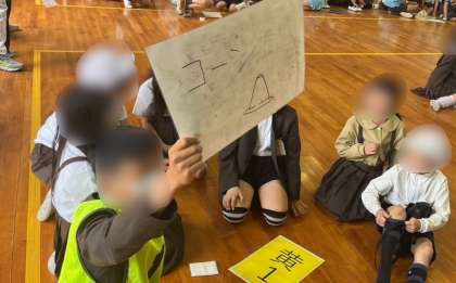 今年度、最初の児童集会は、フラッシュゲームでした。フラッシュゲームは、カーテンの間を通過した物を当てるゲームです。みんな一瞬の間に何が横切ったのか、集中して見ていました。班で答えを出し合ってホワイトボードに書き込んでいました。