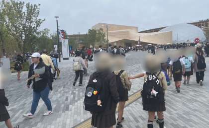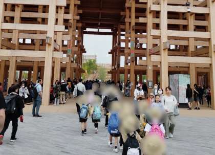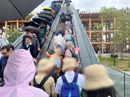 入場する時から大屋根リングにもたくさんの人がいるのが見えました。子どもたちもエスカレーターで大屋根リングに上がりました。上がってみると通路が広く、会場全体を見渡しながら気持ちよく歩くことができました。