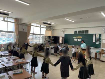 1年生は音楽でした。みんなで円になって手をつなぎ、「ひらいたひらいた」歌いながら、歌詞に合わせて体を動かしました。みんな笑顔でとても楽しそうでした。