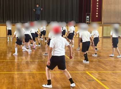 3年生は、体育(講堂)で運動会の練習をしました。ラジオ体操をしっかりとした後、足のステップの練習をしました。3歩のステップで右へ左へと移動する練習です。舞台上の先生の動きをよく見て頑張っていました。