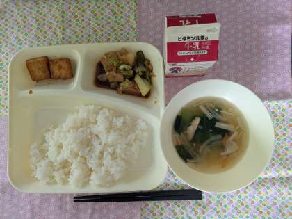 ホイコウロー、中華スープ、あつあげのピリ辛じょうゆかけ、ごはん、牛乳