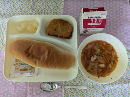 トンカツ、ミネストローネ、和なし(カット缶)、コッペパン、アプリコットジャム、牛乳