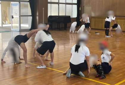 6年生は講堂で組体操の練習をしました。三人組の技に挑戦しました。三人の息がぴったりと合わないとなかなか成功しません。できるまで諦めずに何度も挑戦していました。