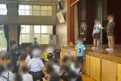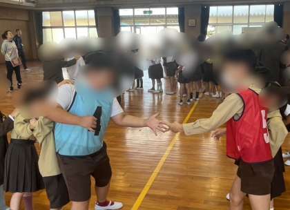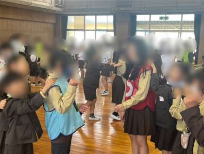今日の児童集会は、じゃんけん列車でした。ビブスを着た6年生の班長がチームの先頭です。音楽がなっている間は移動、音楽が止まれば近くの班長とじゃんけんをします。負ければ勝った班の列の後ろへ、ゲームが進むとどんどん列が長くなっていくゲームです。みんなとっても楽しそうにしていました。
