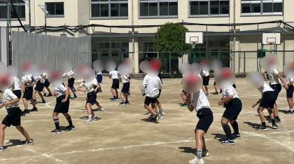 5年生は運動場で団体演技の練習をしました。天気も良く日の光がまぶしい様子でしたが、音楽にあわせて元気いっぱいに体を動かしていました。