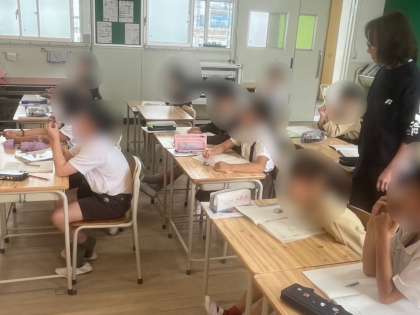 6年生はコグトレに挑戦しました。コグトレとは、認知機能を鍛えるためのトレーニングのことで、紙と鉛筆を使って「覚える」「数える」「写す」「見つける」「想像する」といった力を伸ばすトレーニングです。電子黒板に映された映像を素早く記憶しワークシートに書き出します。みんな集中して取り組んでいました