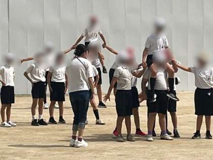 6年生は運動場で団体演技の練習をしました。音楽に合わせて一つ一つの技を確認しながら進めていました。複数人で作る技も、みんなで声を掛け合いながら、安全に気を付けて取り組むことができました。