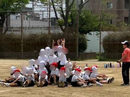 1年生は校外グランドで、運動会の練習をしました。演技しながら場所や隊形などの最終確認と調整を行っていました。暑い中でも頑張って練習することができました。