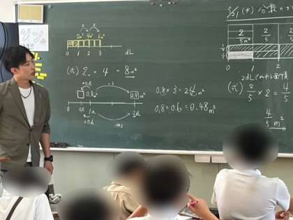 6年生は算数科「分数のかけ算」を学習しました。問題を解決するために、図に描いたり数直線を使ったりと工夫して考えることができました。