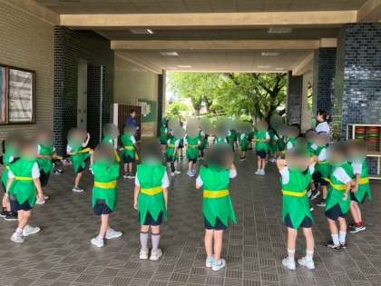 1年生はピロティーで本番用の衣装をつけて団体演技の練習をしました。衣装を着けることで子どもたちのモチベーションも高く、本番に向けて頑張っていました。