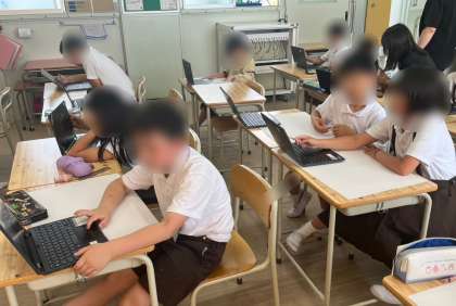 4年生は図画工作科の学習で、関西万博のパビリオンを描きました。全校遠足の時の記憶を思い出しながら、一人一台端末を使って写真を参考にしていました。