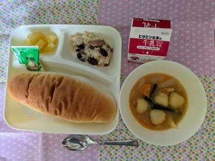 金時豆の中華おこわ、まる天と野菜のうま煮、パインアップル(カット缶)、コッペパン、ソフトマーガリン、牛乳