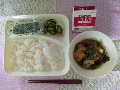 牛肉と野菜のいため煮、きゅうりともやしのおひたし、焼きのり、ごはん、牛乳
