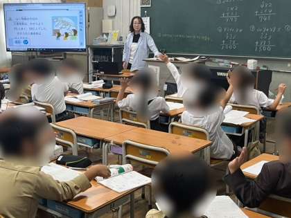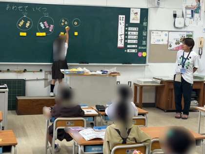 1年生は算数科「あわせて いくつ ふえると いくつ」の学習をしました。教科書の絵を見ながら、机の上で算数ブロックを動かしながら考えました。自分の考えを黒板を使って皆の前で発表することができました。