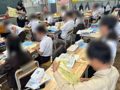 5年生は家庭科「針と糸を使ってぬってみよう」の学習でした。針に糸を通したら、さっそく練習用の布をぬっていきます。縫い終わりは玉どめをします。先生の説明と教科書と練習布の説明、様々な情報を活用して真剣な表情で取り組んでいました。
