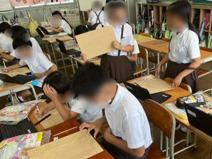 5年生は図画工作科の学習で、伝言板の下絵を描きました。キットの付属品をどこに配置するのかを考えながら、一人一台端末で絵のイメージを検索していました。切り取った部分を別の場所に使うなどの工夫が見られました。