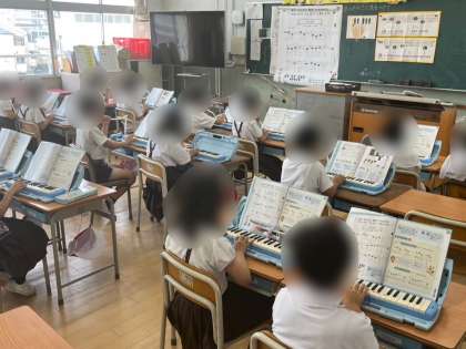 2年生は音楽科「音のたかさに気をつけながら、うたったりふいたりしましょう。」の学習でした。「かっこう」の楽譜を見ながら、鍵盤ハーモニカで合奏しました。音の高さや長さにも注意してふくことができました。