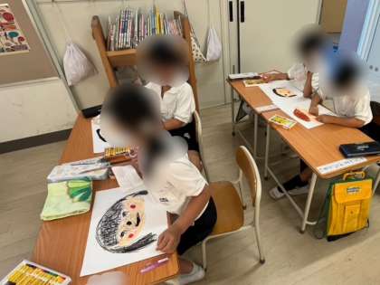 1年生は学級活動で、学級目標の掲示に使う、自分の顔を画用紙にパスを使って描きました。楽しい表情やうれしい表情、優しい表情など、自分の気持ちをしっかりと絵に表現することができました。