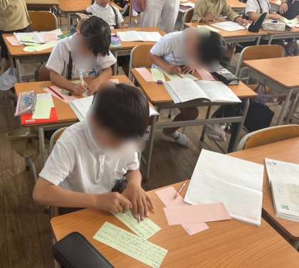 3年生は国語科「「わたし」の説明文を書こう」の学習をしました。金曜日に書いたウェビングマップを使って、文章の組み立てを考えます。「始め、中、終わり」の構成で何について書くのかを決めて書き出すことができました。