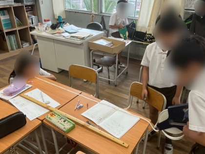 3年生は算数科「巻き尺の使い方を知ろう」の学習をしました。まず、ものさしと巻き尺の違いについて考えます。にている所と違うところを見つけるために、実際に巻き尺を使って、机2台分の縦の長さを測っていました。