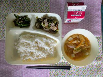 豚肉の梅風味焼き、五目汁、さんどまめのごまあえ、ごはん、牛乳