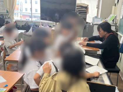 3年生は国語科「わたしの説明文を書こう」の学習をしました。短冊に書いた「始め・なか・終わり」を参考にして、自分の説明文を書きました。より良い説明文にするために、書き終えた人から順に先生に添削してもらいました。