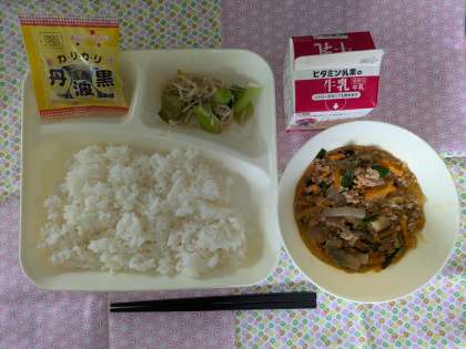 今日の給食の「マーボーはるさめ」は、ツルツルとしたはるさめに少し辛みのあるマーボー味が絡んで、大変好評でした。