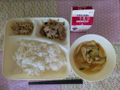 豚肉のごまみそ焼き、五目汁、ツナともやしのいためもの、ごはん、牛乳