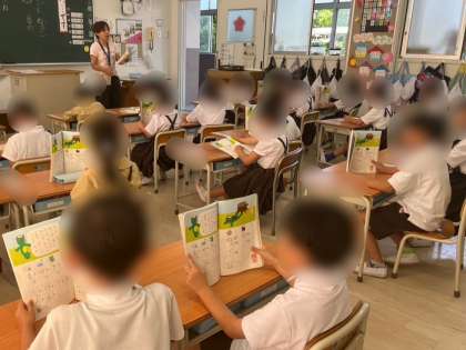 1年生は国語科「ねこと ねっこ」の学習でした。詩を3パートに分けて、音節と文字との関係、アクセントによる語の意味の違いなどに気をつけながら,口形,発声や発音に注意して音読することができました。