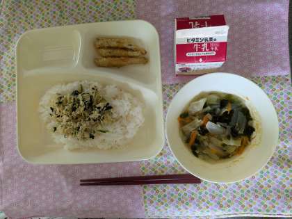 いわしてんぷら、五目汁、とりなっ葉いため、ごはん、牛乳