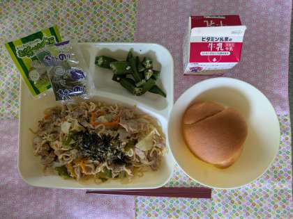 和風焼きそば、オクラのかつお梅風味、まっ茶大豆、ミニコッペパン、牛乳