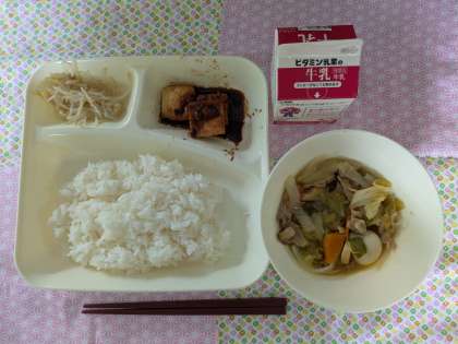 八宝菜、あつあげの中華みそだれかけ、もやしの中華あえ、ごはん、牛乳
