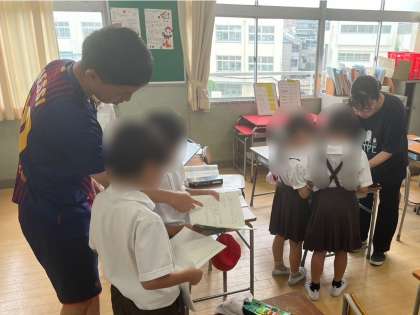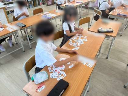 1年生は算数科の学習で二人一組で計算カードを使ったゲームをしました。じゃんけんをして勝った人が机にランダムに並べた計算カードの答えを言います。正解すれば自分の机に計算カードを並べていきます。楽しみながら計算力を高めていました。