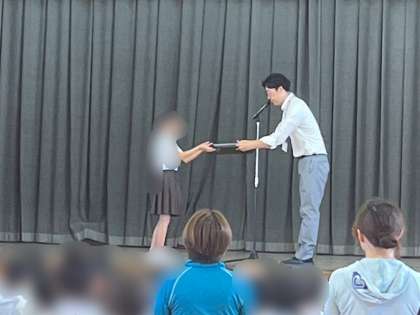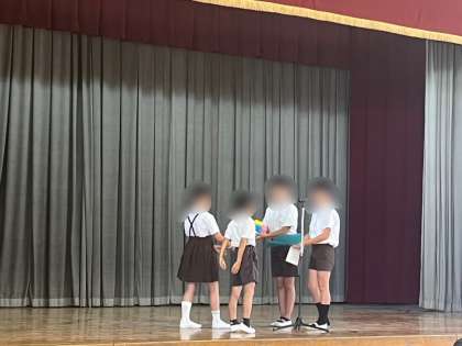 校長先生から児童の表彰と、給食委員会から給食時の身だしなみチェックで優秀だった学級の表彰がありました。
