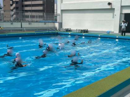 1年生は体育でプールに入りました。手をチョキにして、カニさんになって水の中を横歩きしました。笑顔で楽しく取り組むことができました。