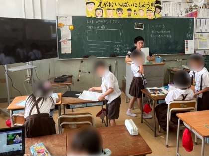 2年生は生活科で自分たちで植えた野菜の苗の成長を記録しました。書いた記録を先生と一緒に確認していました。