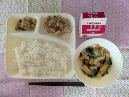 豚肉のしょうが焼き、五目汁、ツナと野菜のいためもの、ごはん、牛乳