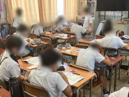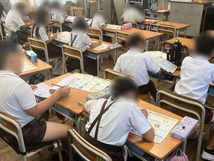 6年生は国語科の学習で「暑中お見舞いを書こう」の学習をしました。学校の掲示板にも貼ってありますが、今日は実際のハガキに書きます。短い便りですが、夏らしい絵とともに思いやりの心を言葉に込めて書いていました。