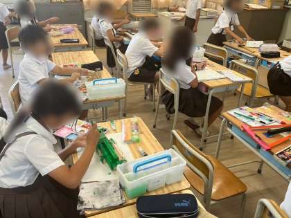 4年生は図画工作科の学習で工作キットのギコギコトントンの仕上げをしました。木材と釘を組み合わせて作った形に、絵の具で色を付けて完成です。細部も細かく丁寧に色塗りをしていました。